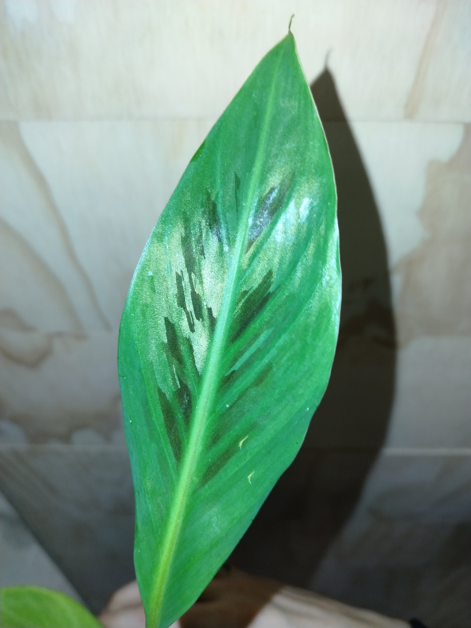 Leaves: Large, paddle-shaped with green and red marbling on the top and solid maroon undersides.