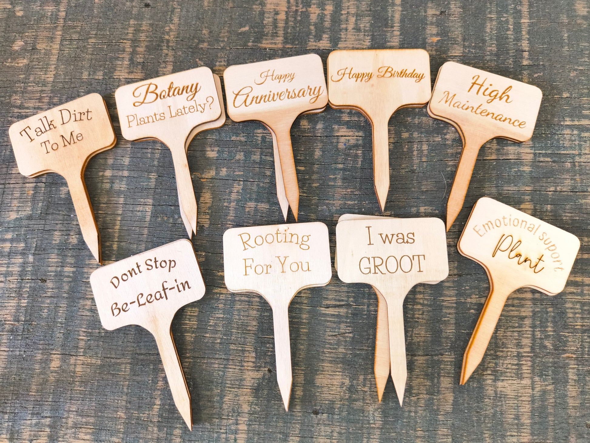 Custom wooden plant stakes. Once the purchase is complete, message us to select the phrase you want. voss@thelavenderboutiquellc.com or text us at 269-392-2125